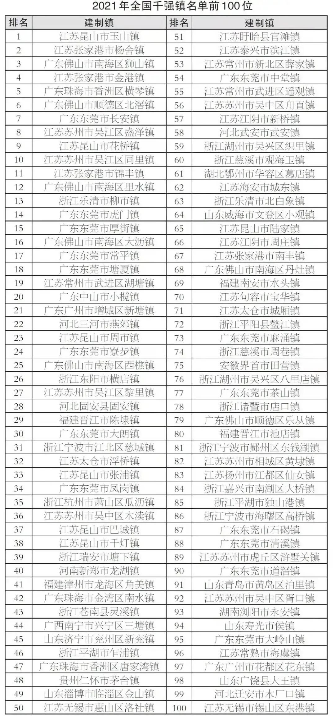 根据中国中小城市发展指数研究课题组等机构发布的《2021年全国千强镇名单》,我国百强镇主要分布在广东、江苏两省,合计占了7成左右。