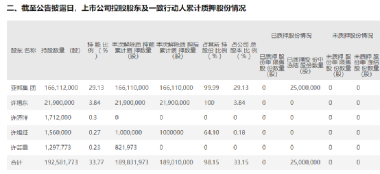 5月7日的一份关于公司实控人股份质押情况的公告显示,亚邦股份控股股东亚邦集团及其一致行动人共持股1.93亿股,占公司总股本的33.77%,其中被质押的股份达到1.89亿股,质押股份占比高达98.15%,占到亚邦股份总股本的33.15%。