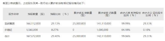 为满足冻结要求,中国结算上海分公司协助法院对亚邦集团及许旭征所持有的已质押的公司股份1.42亿股进行标记,标记的期限与冻结期限一致,上述标记和冻结的股票产生的孽息一并标记和冻结。这样,截至2022年9月25日,亚邦集团持有的上市公司股份99.99%已被司法冻结或在司法标记。