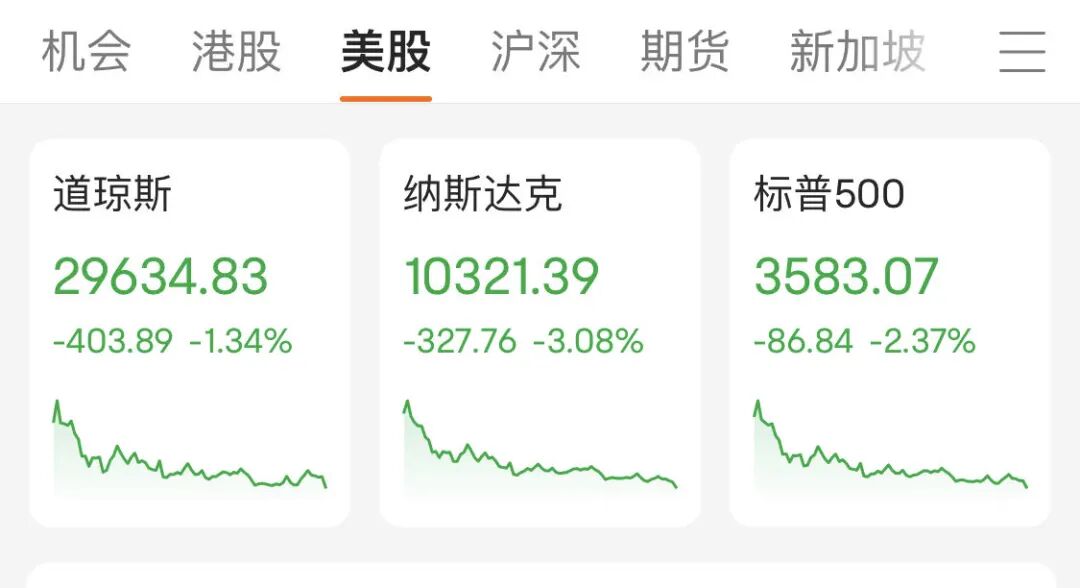 数据显示,隔夜,美股高开低走集体收跌,截至收盘,道琼斯指数跌1.34%,报29634.83点;纳斯达克指数跌3.08%,报10321.39点;标普500指数跌2.37%,报3583.07点。