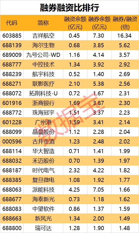 数据宝统计,融券余额超过融资余额的个股中,科创板股票数量较多,合计有27只,占比达到75%。像海尔生物、九号公司-WD、中控技术、航宇科技、联影医疗、拓荆科技-U等融券余额是融资余额2倍的个股,均为科创板公司。