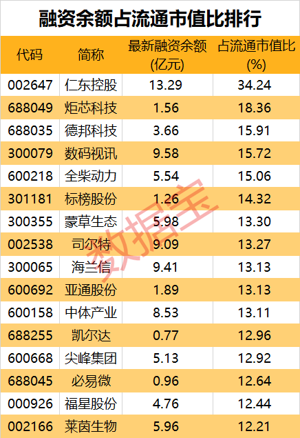 数据宝统计,以占比看,有72股融资余额占流通股比例超过10%,仁东控股以34.24%的占比高居榜首,公司最新融资余额13.29亿元。近期,公司因虚增2019年度和2020年半年度利润,被投资者诉证券虚假陈述案正式开庭。此外,公司控股股东仁东信息所持有的1490万股股票被拍卖,拍卖成交价为9120.14万元。