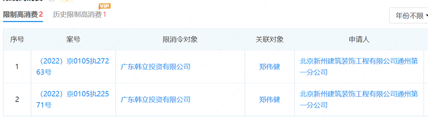 另外,据企查查统计,截至11月24日,广东韩立投资有限公司已收到涉及纠纷的裁判文书70份,作为被告涉及金额超过1亿元。该公司及其法定代表人郑伟健已被限制高消费。