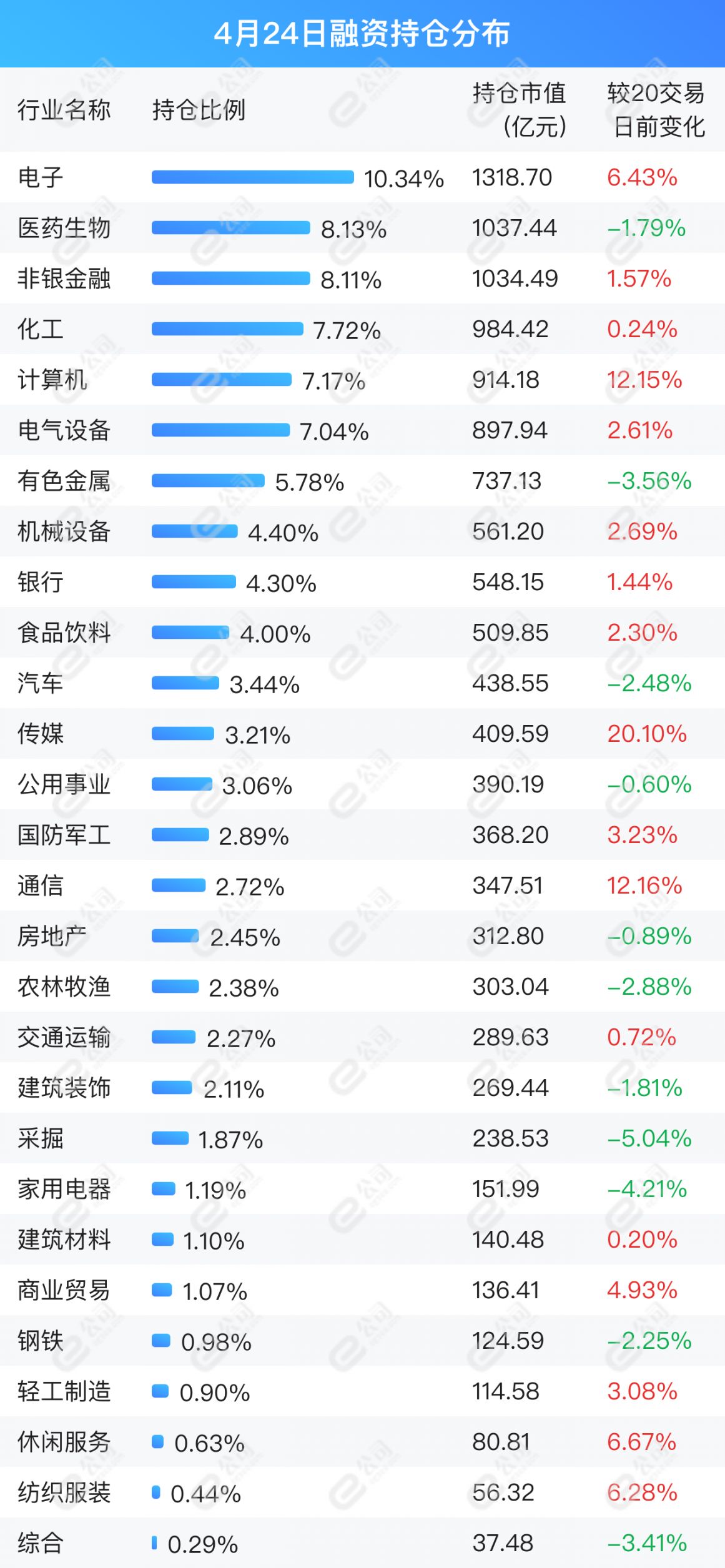 e公司数据统计显示,截至4月24日,融资持仓市值前五行业为电子、医药生物、非银金融、化工、计算机,占持仓总市值41.47%。