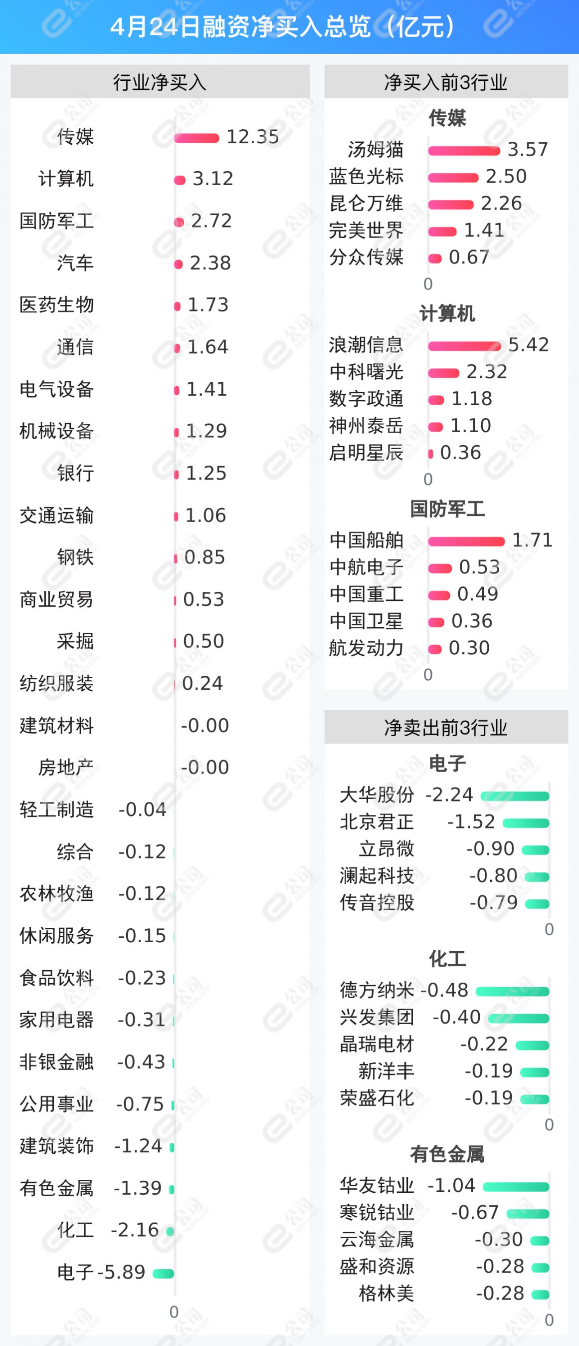 传媒、计算机、国防军工获融资净买入金额居前,分别为12.35亿元、3.12亿元、2.72亿元。