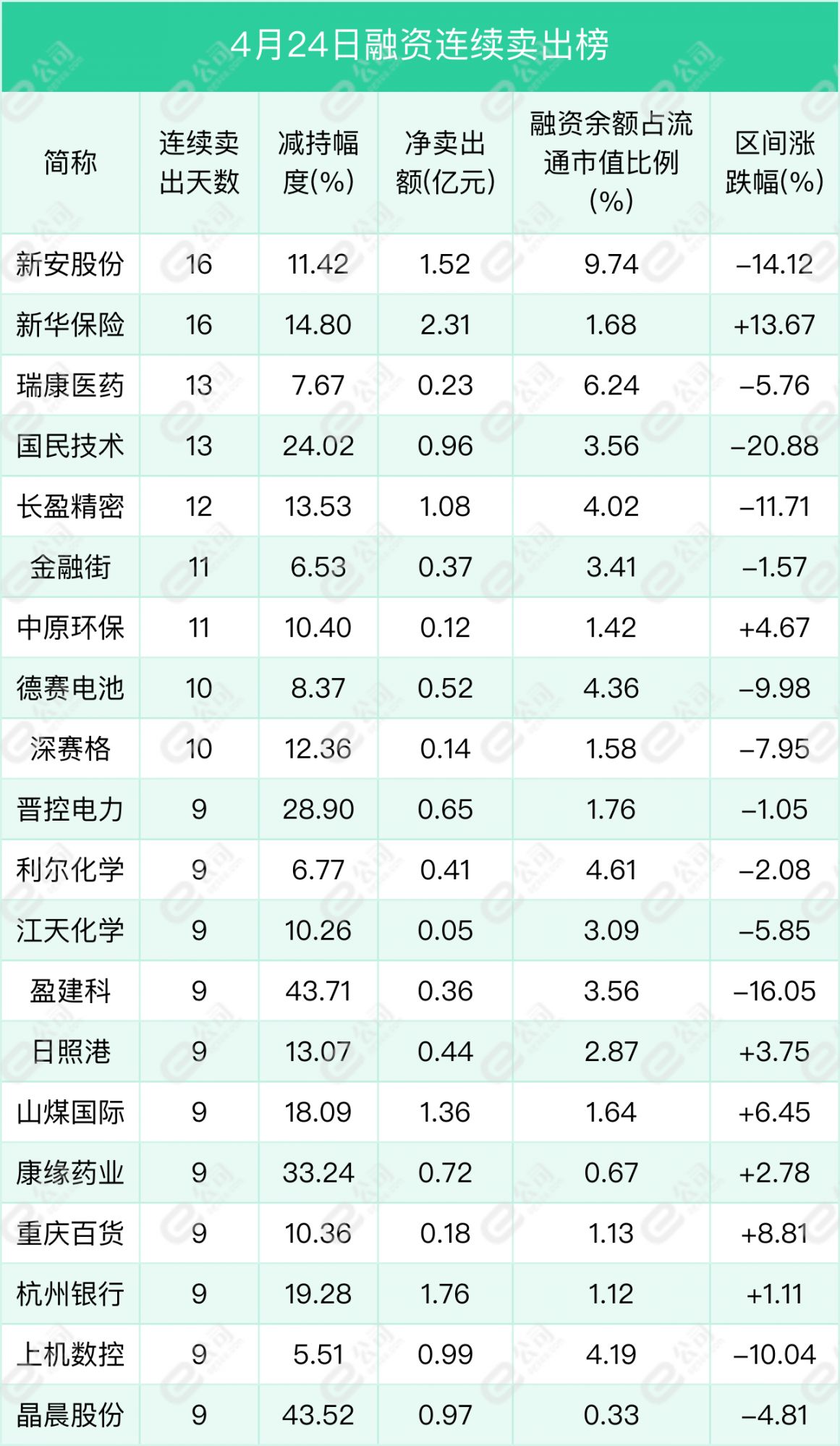 新安股份、新华保险、瑞康医药遭融资连续净卖出天数居前,分别为16天、16天、13天,期间净卖出额分别为1.52亿元、2.31亿元、0.23亿元,期间减持幅度分别为11.42%、14.8%、7.67%。