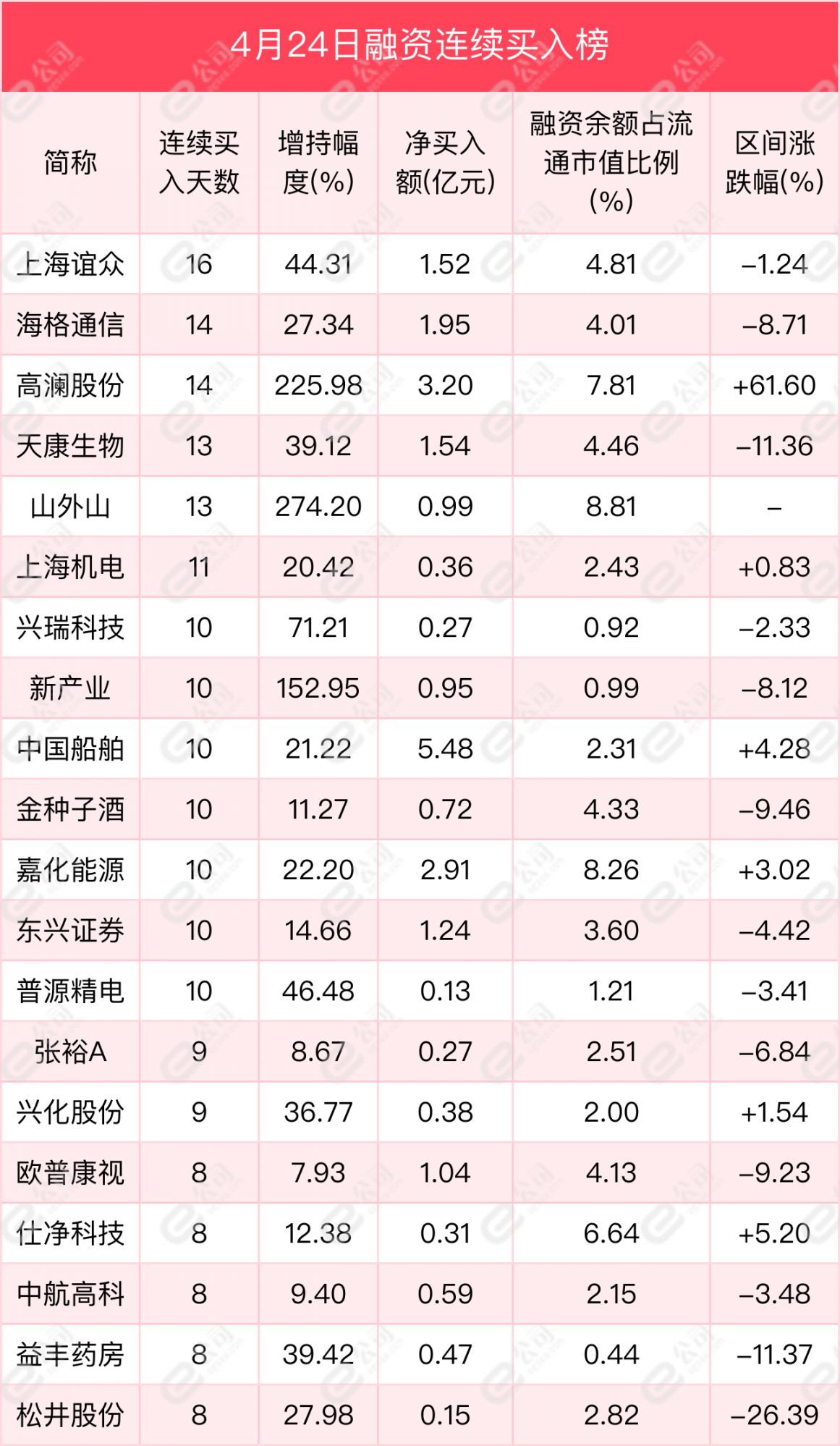 从连续买卖来看,上海谊众、海格通信、高澜股份获融资连续净买入天数居前,分别为16天、14天、14天,期间净买入额分别为1.52亿元、1.95亿元、3.2亿元,期间增持幅度分别为44.31%、27.34%、225.98%。
