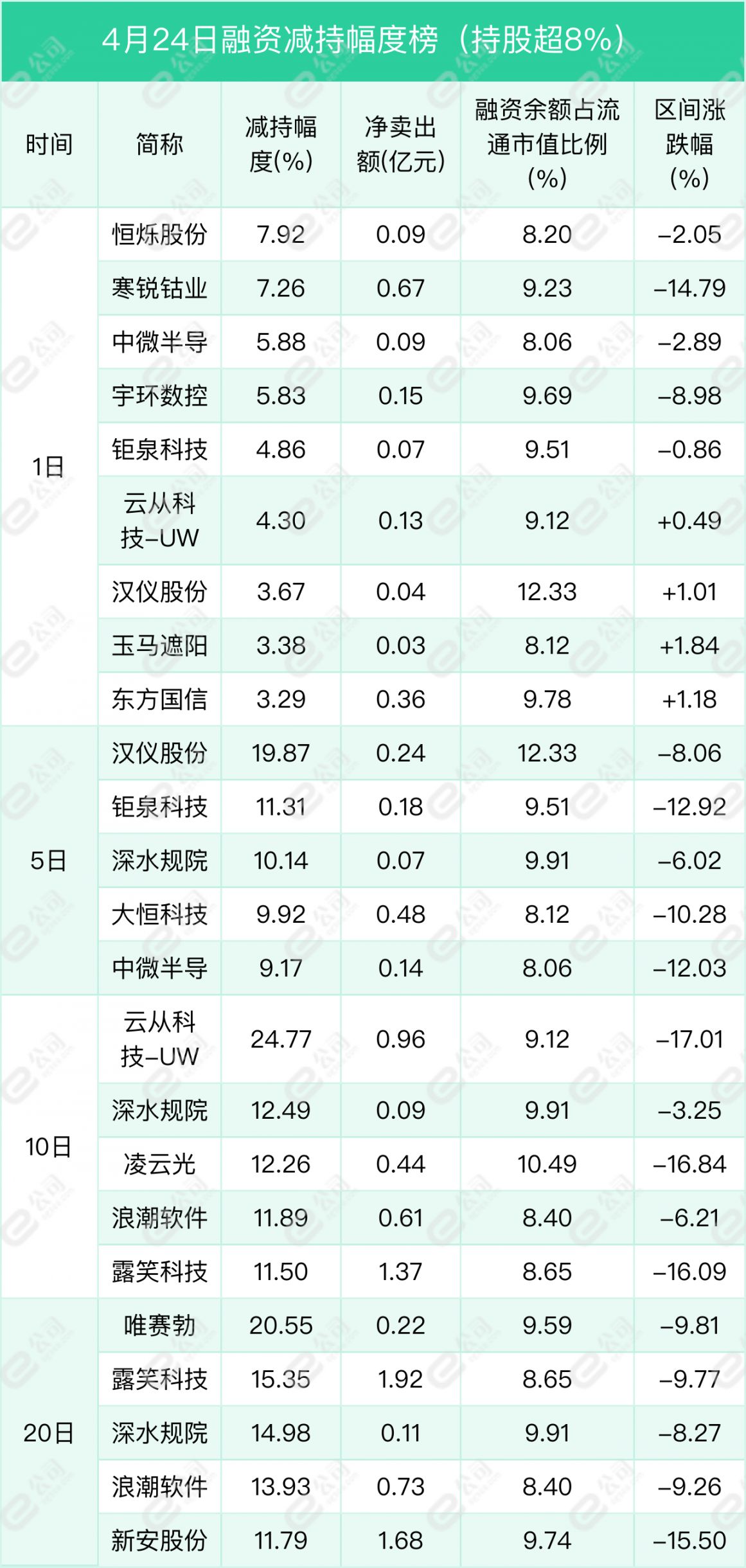 恒烁股份、寒锐钴业、中微半导遭融资减持幅度居前,分别为7.92%、7.26%、5.88%。