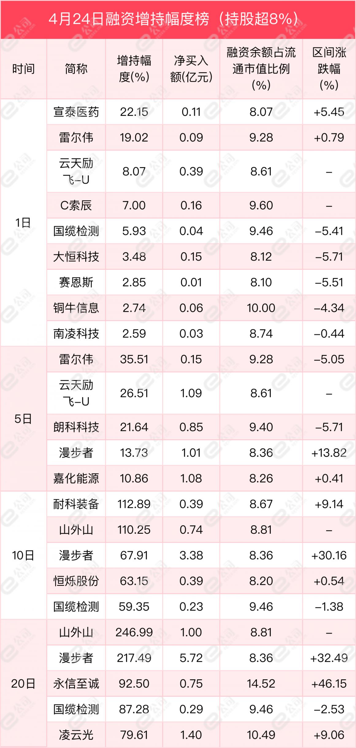 从增减持幅度来看,融资余额占流通股比例超8%的个股中,宣泰医药、雷尔伟、云天励飞-U获融资增持幅度居前,分别为22.15%、19.02%、8.07%。