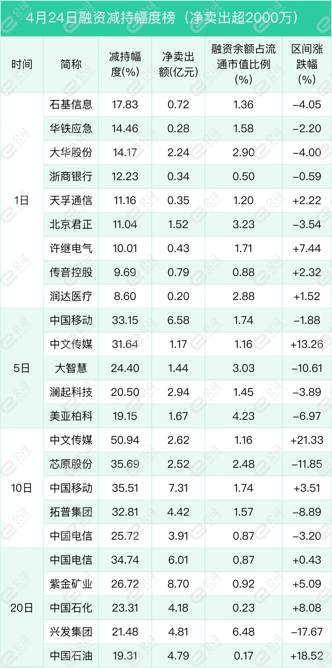 石基信息、华铁应急、大华股份遭融资减持幅度居前,分别为17.83%、14.46%、14.17%。