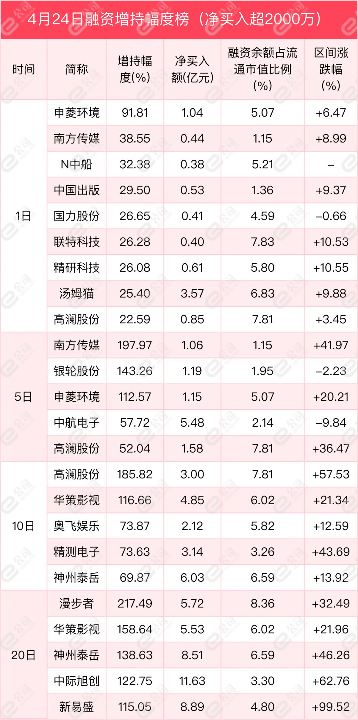从增减持幅度来看,单日净买卖超2000万元以上的个股中,申菱环境、南方传媒、N中船获融资增持幅度居前,分别为91.81%、38.55%、32.38%。