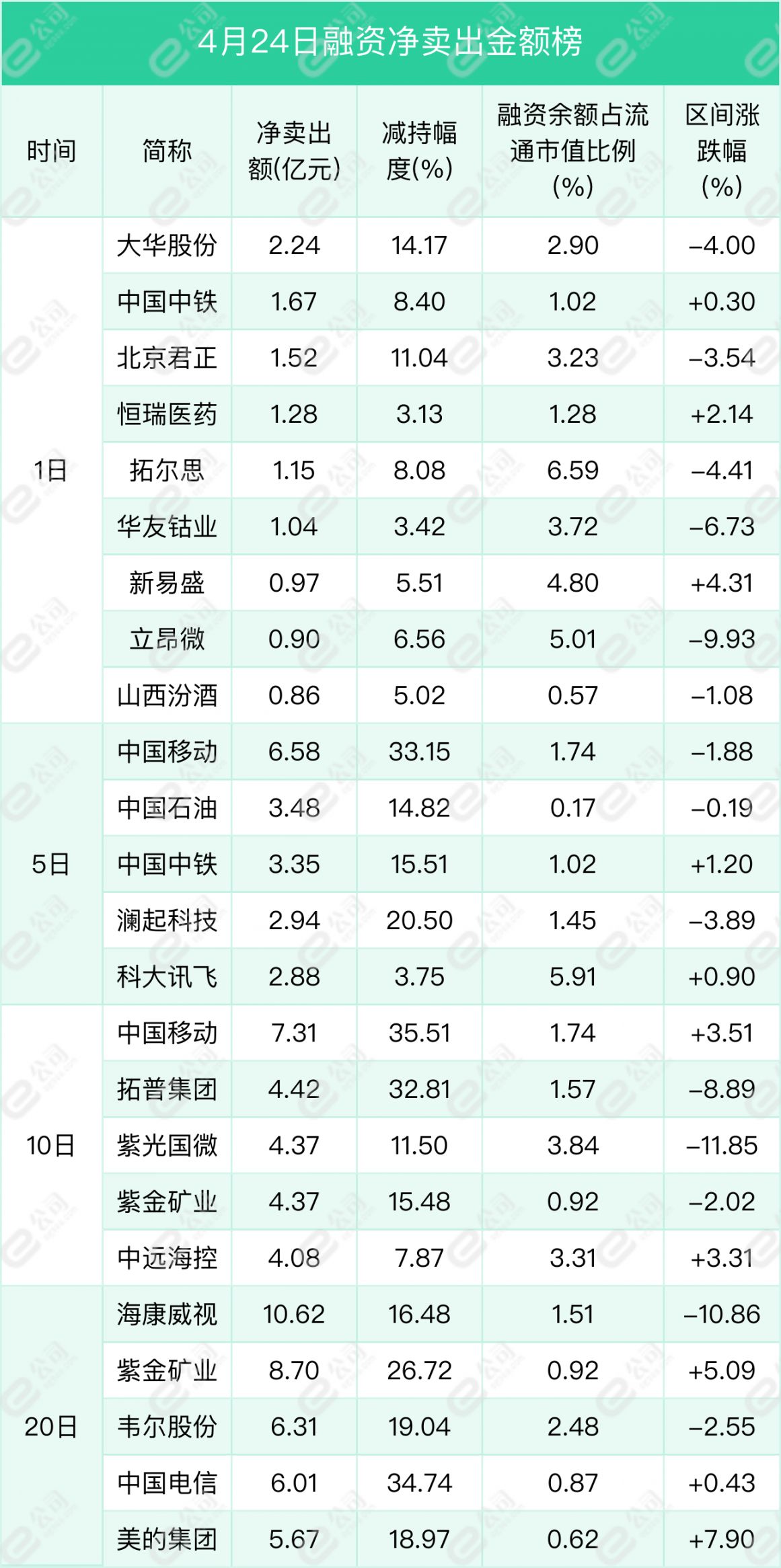 大华股份、中国中铁、北京君正遭融资净卖出金额居前,分别为2.24亿元、1.67亿元、1.52亿元,减持幅度分别为14.17%、8.4%、11.04%。