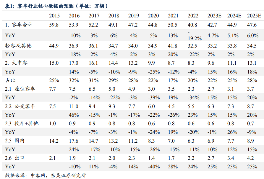 疫情后出行需求恢复+公共交通客车替换周期+海外市场复苏,2023-2025年大中客行业总销量预计实现9.6万/11.1万/13.1万,同比+15%/+16%/+18%。国内座位客车格局集中,宇通市占率40%+,金龙市占率20%+;国内公共交通客车格局较分散,宇通市占率20%+,金龙市占率15%+。2022年行业盈利仍在磨底,公司率先走出拐点。中期来看,量-价-成本-利有望盈利四重共振,净利润中枢有望持续回升。