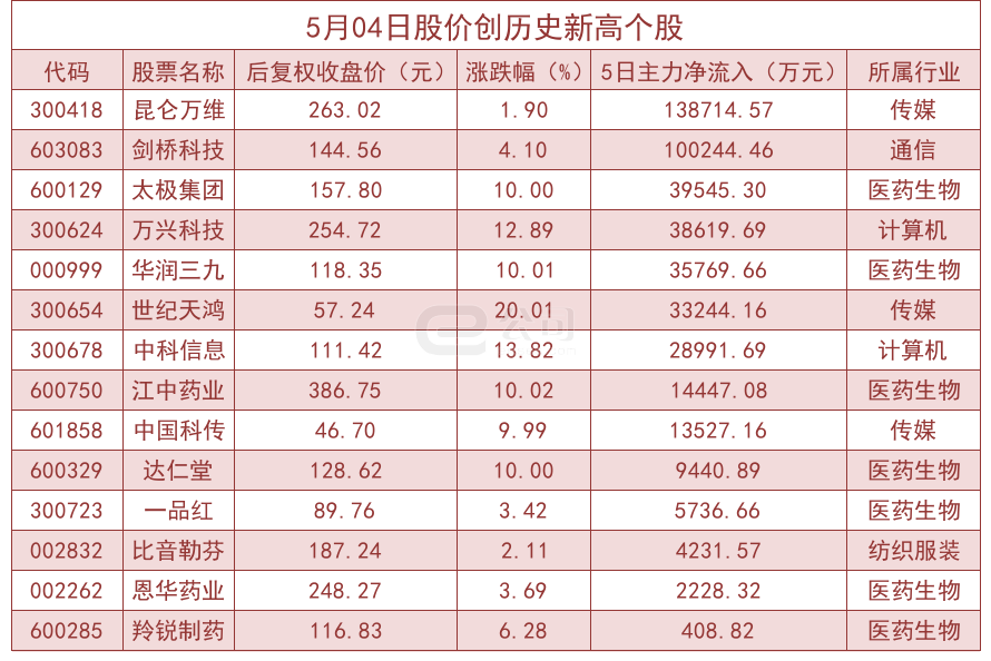 截止5月04日最新收盘,两市共有14只个股股价创历史新高。其中昆仑万维、剑桥科技、太极集团等5日主力资金净流入较为明显。