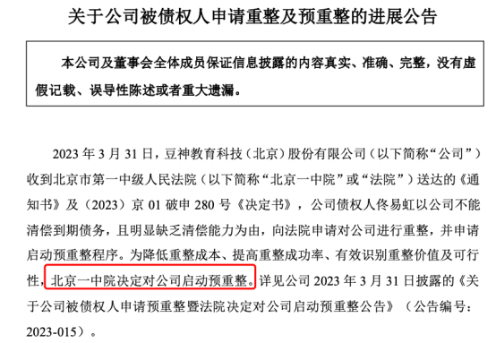 今年3月,*ST豆神又收到法院通知书,公司债权人以公司不能清偿到期债务,且明显缺乏清偿能力为由,向法院申请对公司进行重整,并申请启动预重整程序。北京一中院决定对公司启动预重整。