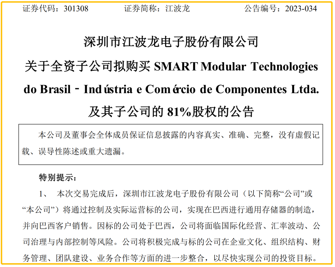 6月13日晚间,江波龙公告,拟以现金通过子公司Lexar Europe B.V.购买SMART Brazil及其全资子公司SMART Modular的81%股权。目标公司企业价值为2.05亿美元,购买81%股权的支付价款将依据交易协议所约定的计算方式及价格调整机制确定。交易完成后,江波龙将通过控制及实际运营标的公司,实现在巴西进行通用存储器的制造,并向巴西客户销售。