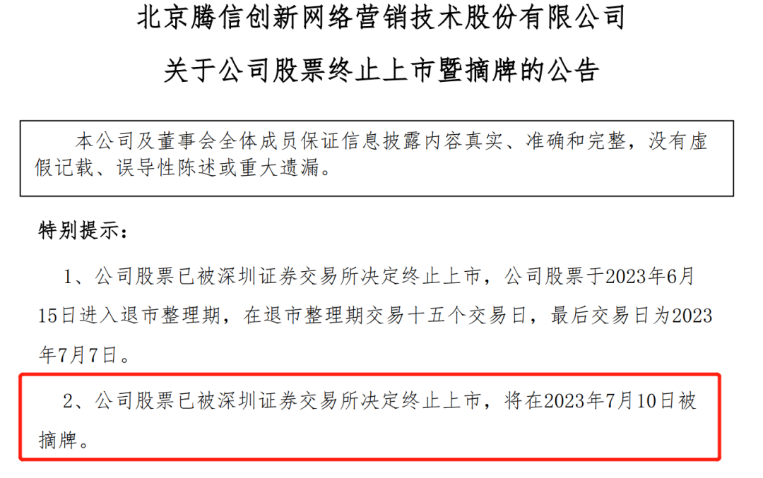 市场对深南退、腾信退的摘牌早有预期。6月7日,两家公司均宣布收到深交所终止上市的决定,并于6月15日进入退市整理期。按照规定,退市整理期交易期限为15个交易日,两家公司最后交易日期均为7月7日,将在次一交易日(即7月10日)摘牌。