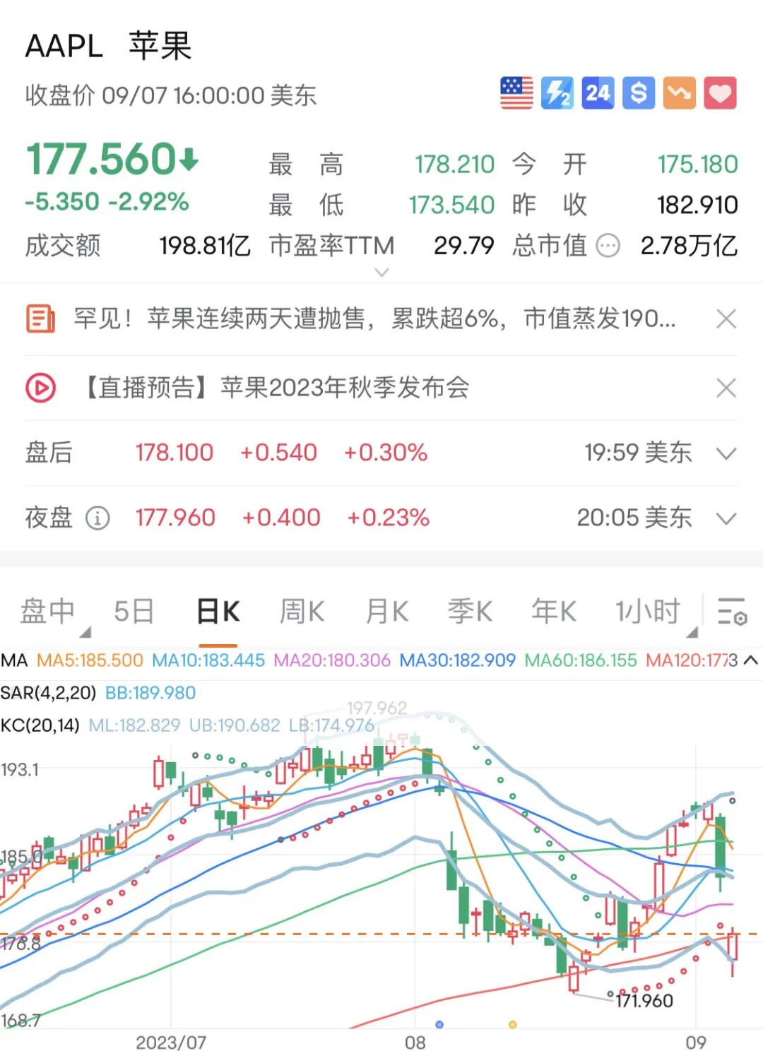 而苹果股价连续两天大跌。一方面,下周公布iPhone 15系列手机,会跟目前卖爆的华为手机形成激烈竞争,另一方面有报道称iPhone手机在某些场合已被禁用。