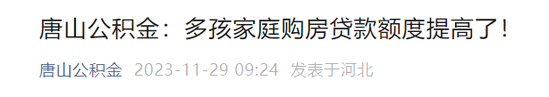 11月29日,据“唐山公积金”公众号消息,多孩家庭购房贷款额度提高了。