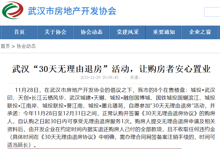 据武汉市房地产开发协会消息,11月28日,在武汉市房地产开发协会的倡议之下,武汉市的8个在售楼盘自愿参加“30天无理由退房”活动,并承诺:今年11月28日至12月31日之间,正常认购并签署《30天无理由退房协议》的购房人,自认购之日起30日内可享受无理由退房服务1次。购房人提交无理由退房申请及相关资料后,由开发企业在约定时间内据实退还购房人已付的全部款项,且不收取任何违约金。
