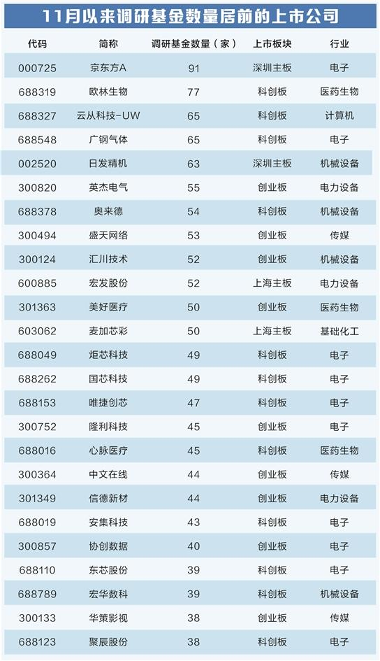 e公司讯,证券时报·数据宝统计,11月以来,公募基金密集调研电子、机械设备、医药生物等赛道的公司。具体来看,截至12月1日,11月以来公募基金合计调研819家上市公司。电子行业共有140家公司获得基金调研,数量最多。其中参与调研京东方A、广钢气体、炬芯科技、国芯科技的基金数量居前,分别有91家、65家、49家、49家。综合来看,芯片方向仍是基金调研的重点。机械设备行业共120家公司获得基金调研,日发精机、奥来德和汇川技术的调研基金数量居前,均在50家以上。机器人概念股受到特别的重视,汇川技术、步科股份、国机精工的调研基金数量均超过20家。