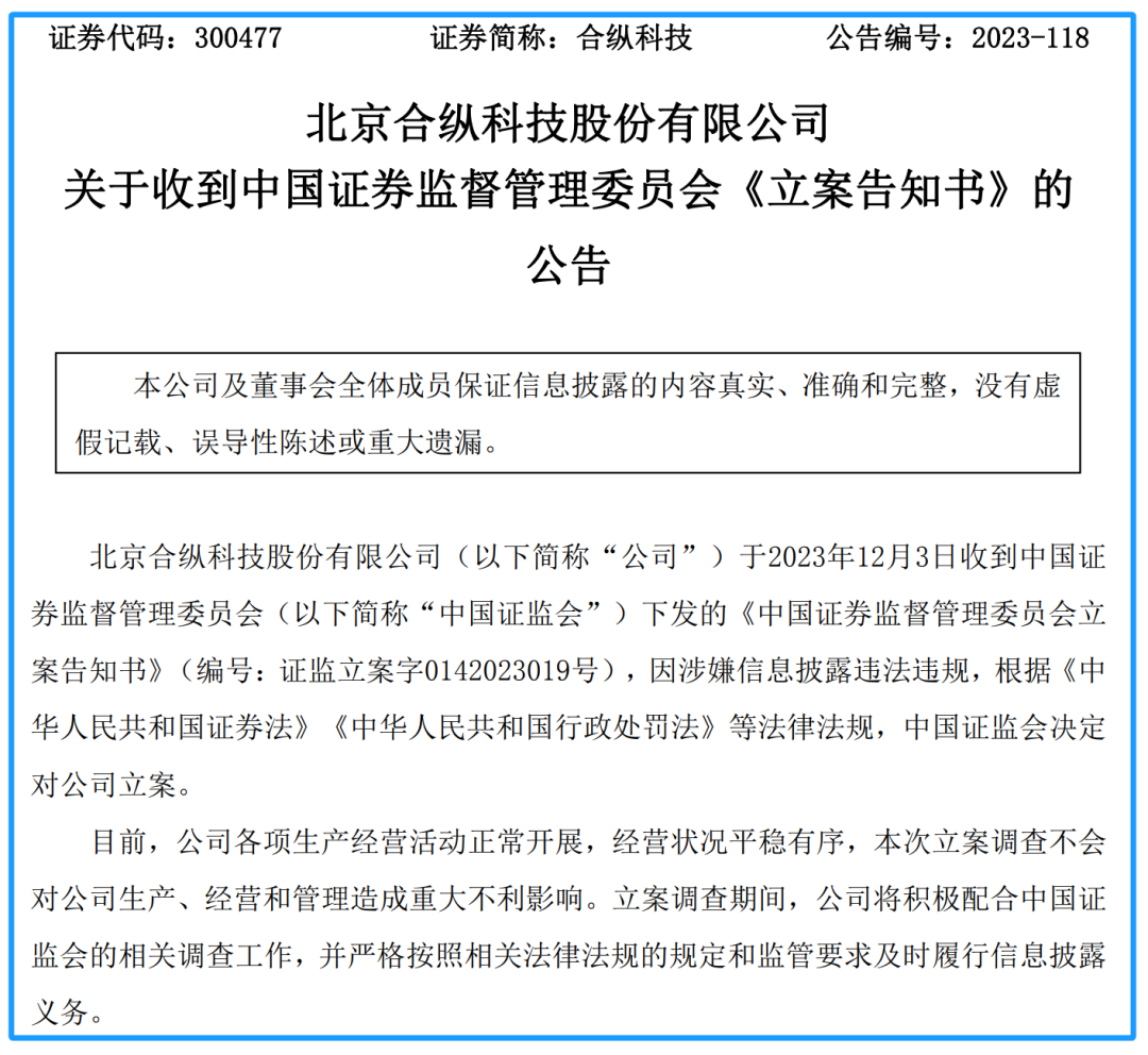 12月3日晚间,合纵科技公告,公司于当日收到中国证监会下发的立案告知书,因涉嫌信息披露违法违规,证监会决定对公司立案。