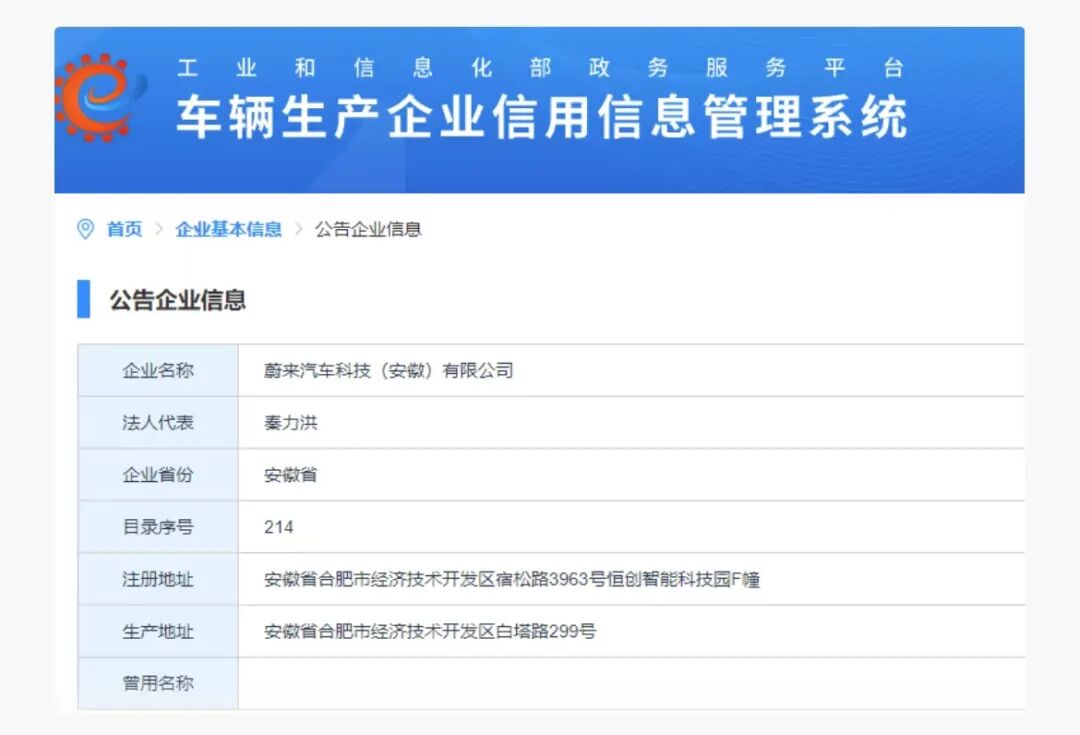 12月4日,蔚来汽车科技(安徽)有限公司出现在工信部的车辆生产企业信用信息管理系统中,或标志着蔚来已获独立造车资质。