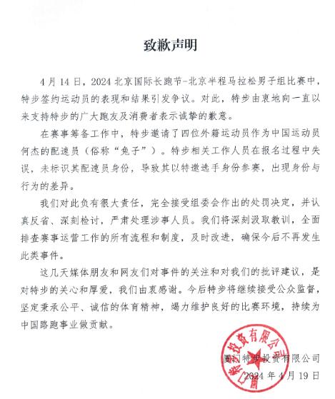 e公司讯,特步就北京半程马拉松赛发布致歉声明称,在赛事筹备工作中,邀请了四位外籍运动员作为中国运动员何杰的配速员。特步相关工作人员在报名过程中失误,未标识其配速员身份,导致其以特邀选手身份参赛,出现身份与行为的差异。特步表示,完全接受组委会作出的处罚决定,并认真反省、深刻检讨,严肃处理涉事人员。公司将深刻汲取教训,全面排查赛事运营工作的所有流程和制度,及时改进,确保今后不再发生此类事件。