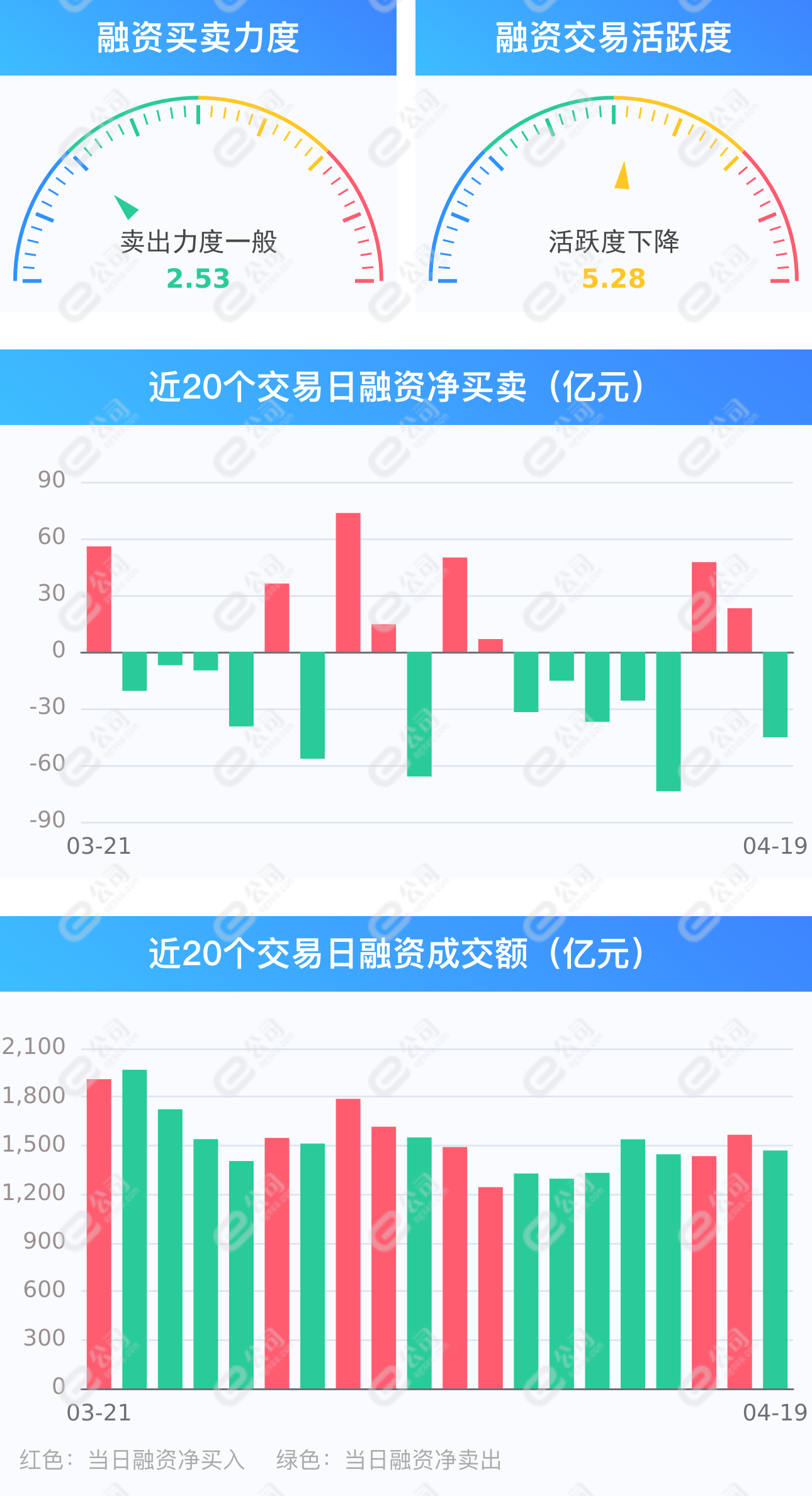 e公司讯,截至4月19日,上交所融资余额报7879.31亿元,较前一交易日减少21.16亿元;深交所融资余额报6992.50亿元,较前一交易日减少24.2亿元;两市合计14871.80亿元,较前一交易日减少45.36亿元,融资交易额1468.70亿元,占A股成交额17.07%,其中融资买入额711.67亿元,融资偿还额757.03亿元,交易活跃度下降6.22%。