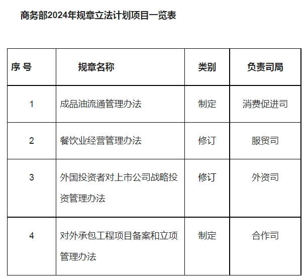 e公司讯,商务部发布2024年规章立法计划。具体安排如下:为加强成品油流通管理,明确监管规则和标准,推进成品油流通规范有序高质量发展,制定《成品油流通管理办法》(消费促进司起草)。为落实《反食品浪费法》有关要求,完善餐饮业管理机制,推进餐饮业高质量发展,修订《餐饮业经营管理办法》(服贸司起草)。为进一步放宽外国投资者对上市公司战略投资限制,创新监管方式,修订《外国投资者对上市公司战略投资管理办法》(外资司起草)。为进一步完善对外承包工程管理,促进对外承包工程高质量发展,制定《对外承包工程项目备案和立项管理办法》(合作司起草)。
