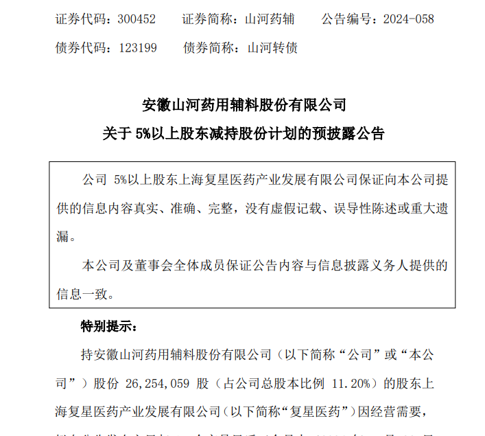 6月28日晚间,山河药辅(300452)公告,公司持股11.2%的股东上海复星医药产业发展有限公司(简称“复星医药”)因经营需要,拟以集中竞价交易方式减持公司股份不超过232.6万股,即不超过公司总股本(扣除公司回购股份182.55万股)的1%。