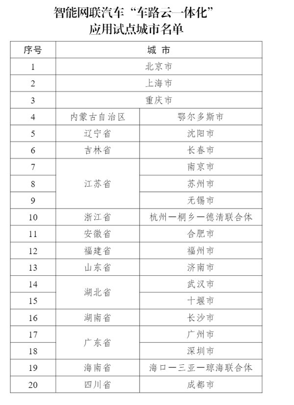 e公司讯,据工业和信息化部消息,工信部联合公安部、自然资源部、住房和城乡建设部、交通运输部发布通知,公布了20个智能网联汽车“车路云一体化”应用试点城市名单。
