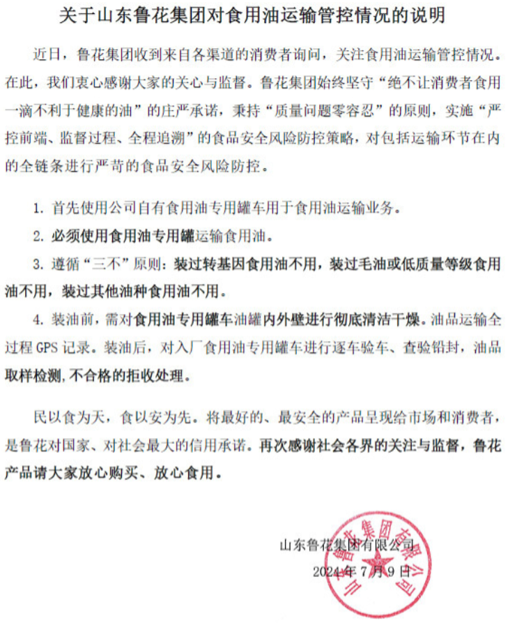 7月9日,鲁花集团发布声明称,公司对包括运输环节在内的全链条进行严苛食品安全风险防控,使用公司自有食用油专用罐车用于食用油运输业务。装油前对食用油专用罐车油罐内外壁进行彻底清洁干燥。装油后,对入厂食用油专用罐车进行逐车验车、查验铅封,油品取样检测,不合格的拒收处理。请大家放心购买、放心食用。
