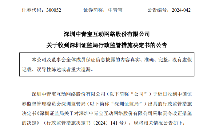 据中青宝披露,该公司于近日收到深圳证监局出具的行政监管措施决定书《深圳证监局关于对深圳中青宝互动网络股份有限公司采取责令改正措施的决定》。