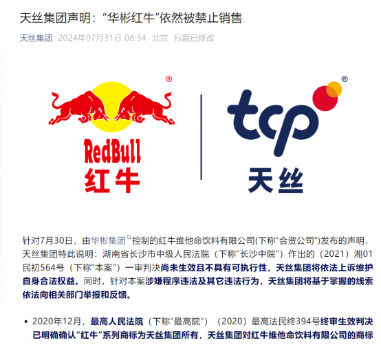 7月30日,中国红牛在官方渠道发布声明称,长沙中院相关民事判决书7月29日已驳回泰国天丝起诉中国红牛长沙经销商华厦糖酒公司商标侵权的全部诉讼请求。