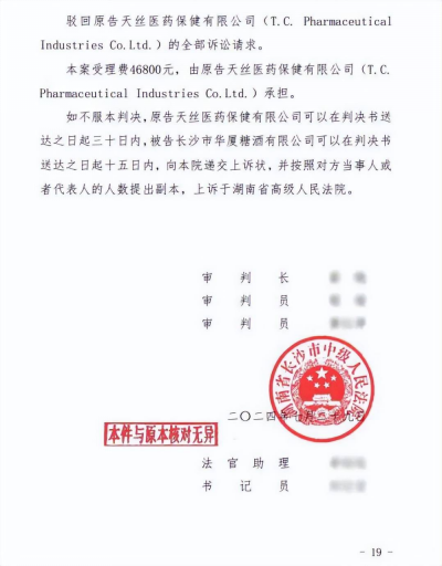 再往前回溯,2021年,泰国天丝以侵害商标权为由发起对中国红牛产业链合作伙伴长沙市华厦糖酒有限公司的诉讼。