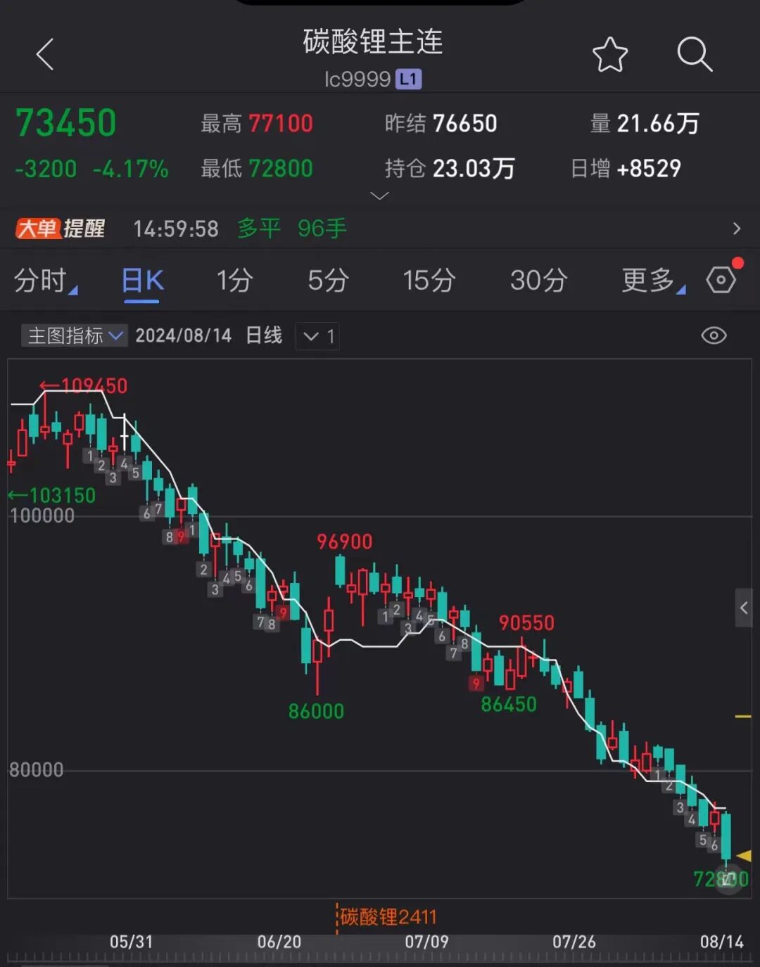 8月14日,国内锂价再度大跌。期货碳酸锂主力合约(lc2411)下跌3200元/吨,收跌至7.35万元/吨,跌幅达到4.17%。
