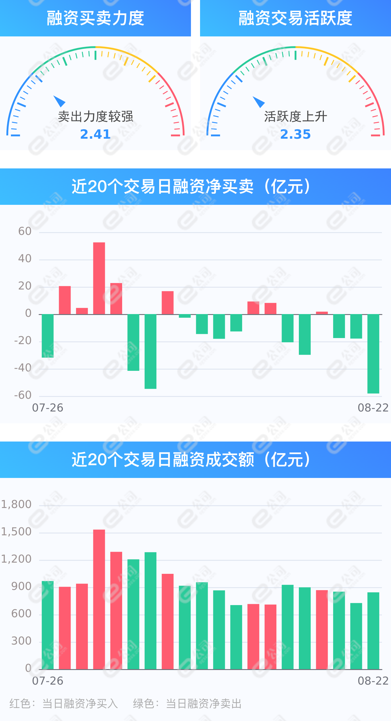 e公司讯,截至8月22日,上交所融资余额报7320.36亿元,较前一交易日减少31.64亿元;深交所融资余额报6576.51亿元,较前一交易日减少26.5亿元;两市合计13896.87亿元,较前一交易日减少58.14亿元,融资交易额843.63亿元,占A股成交额15.36%,其中融资买入额392.74亿元,融资偿还额450.89亿元,交易活跃度上升16.22%。