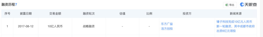 天眼查信息显示,2017年,锤子科技曾获得了10亿元的战略投资,投资方为东方广益和浩方创投。其中,东方广益成立于2003年8月,是由成都市成华区人民政府授权成都市成华区国有资产监督管理和金融工作办公室履行出资人职责,投资组建的国有独资公司。