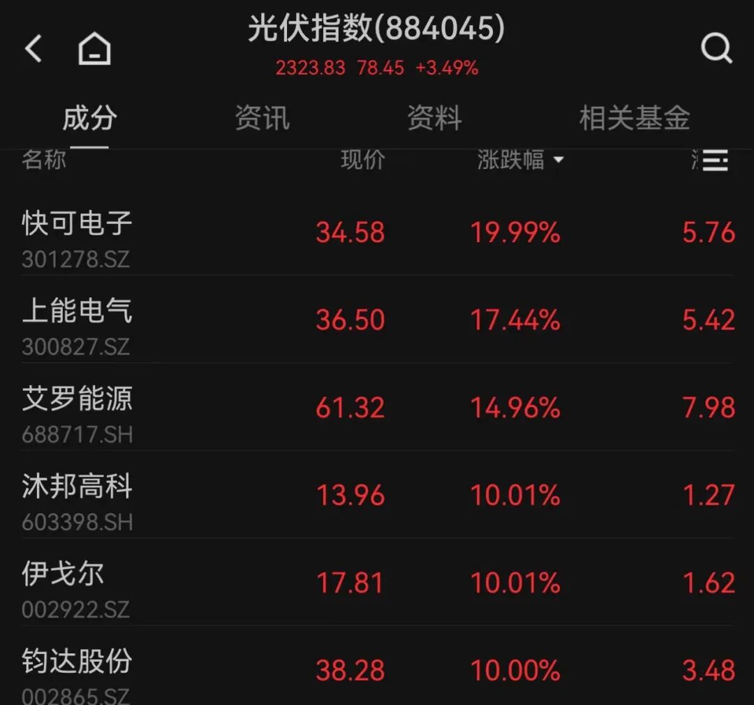 新能源概念也全线走强,光伏、储能两大板块掀涨停潮。光伏板块,快可电子20%涨停,钧达股份、伊戈尔等逾10股涨停;储能板块也有鹏辉能源、奋达科技等超10股涨停。