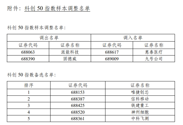 e公司讯,根据指数规则,上海证券交易所与中证指数有限公司决定调整科创50等指数样本,于2024年9月13日收市后生效。其中科创50指数更换2只样本。