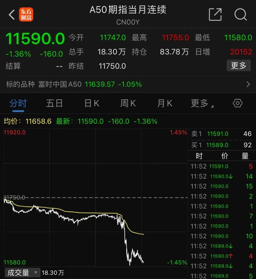 A50期货指数盘中直线跳水,截至发稿跌幅为1.36%。