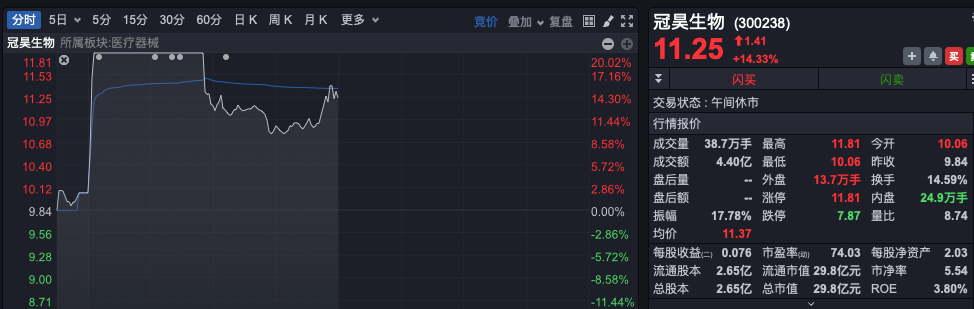 免疫治疗板块盘初放量直线拉升涨近3%,半日成交接近前一交易日全天成交。冠昊生物开盘仅约2分钟股价就垂直冲击20%涨停,后虽有所回落,但仍大涨逾10%;南华生物同样垂直拉涨,仅1分钟即涨停,中源协和也强势封板,泰林生物等涨幅居前。