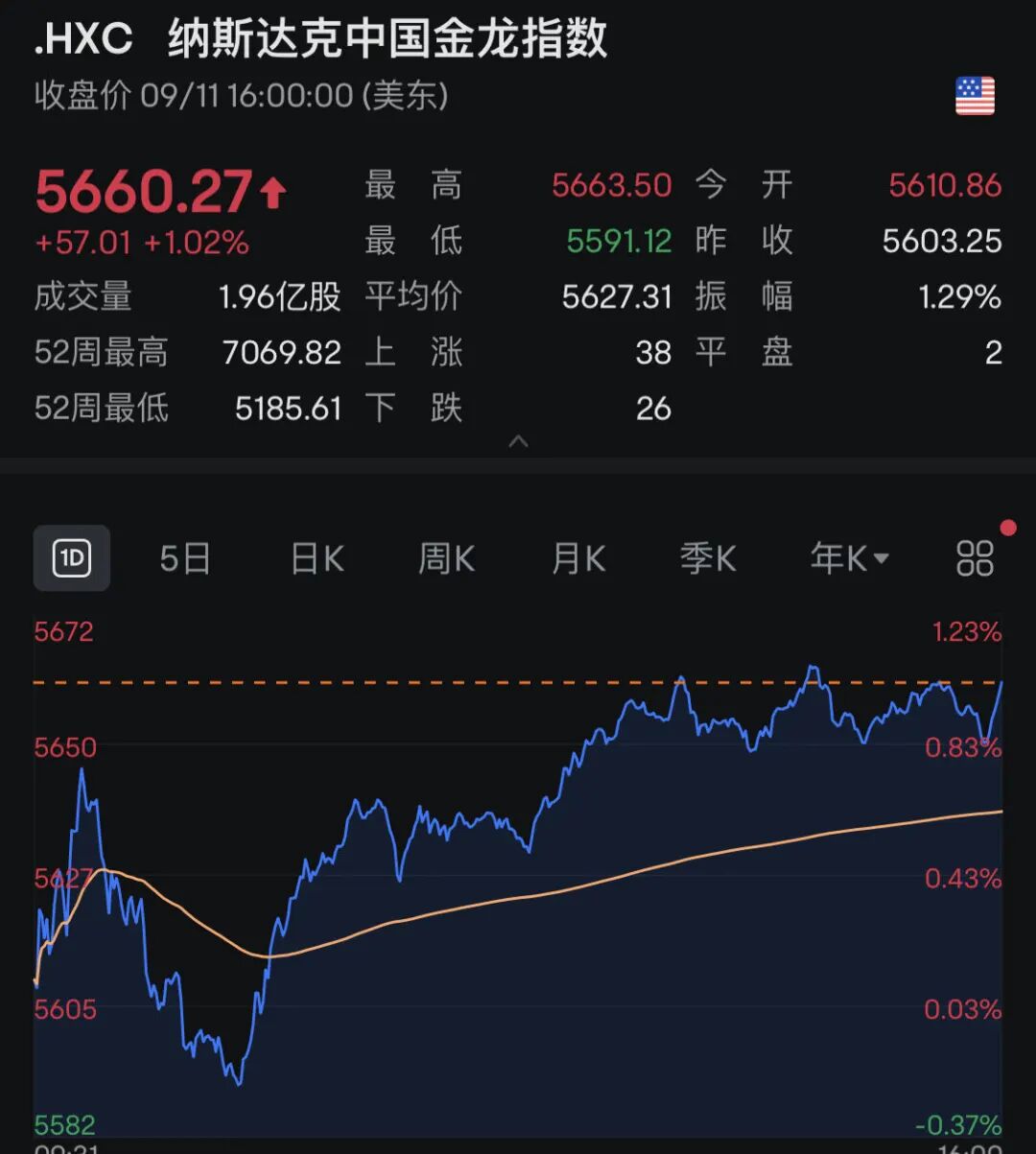 中概股也普遍上涨,纳斯达克中国金龙指数涨逾1%,硕迪生物涨15.11%,阿特斯太阳能涨11.8%,小鹏汽车涨超4%。
