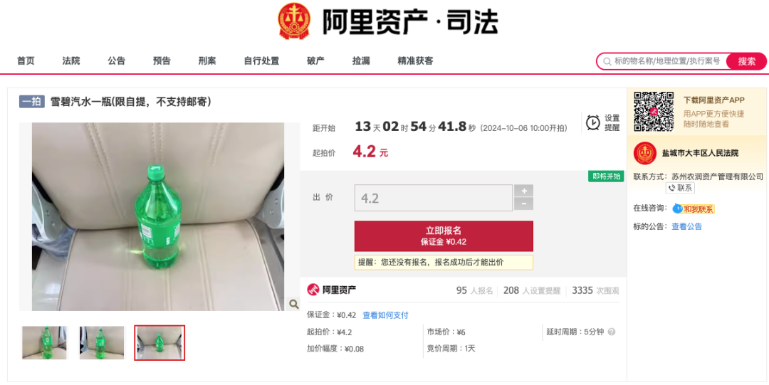 拍卖信息显示,上述拟拍卖的雪碧存放于大丰法院执行局内,且该物品只能自提,不支持邮寄。此次拍卖的起拍价为4.2元,保证金0.42元,增价幅度为0.08元。这瓶雪碧所有人为自然人陈爱清、张冬娣。