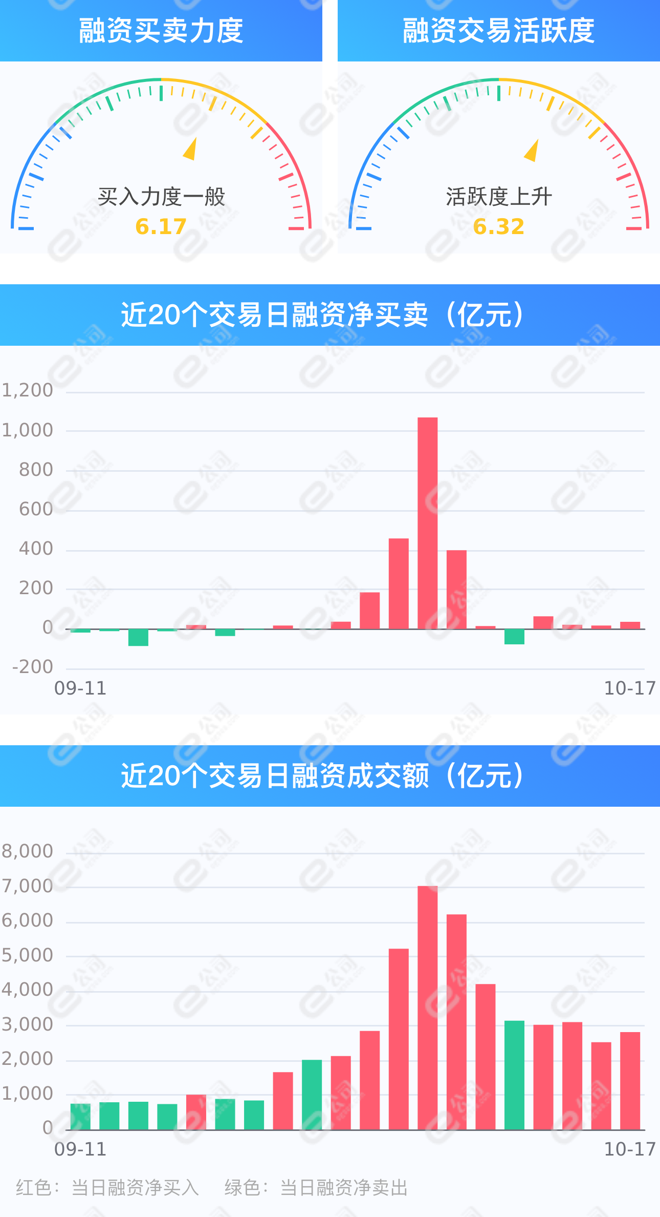 e公司讯,截至10月17日,上交所融资余额报8284.90亿元,较前一交易日增加15.77亿元;深交所融资余额报7553.05亿元,较前一交易日增加19.89亿元;两市合计15837.94亿元,较前一交易日增加35.66亿元,融资交易额2813.56亿元,占A股成交额18.87%,其中融资买入额1424.61亿元,融资偿还额1388.95亿元,交易活跃度上升11.49%。统计发现,融资客保持连续4日净买入,净买入额分别为63.99亿元、21.16亿元、16.92亿元、35.66亿元,合计137.73亿元。