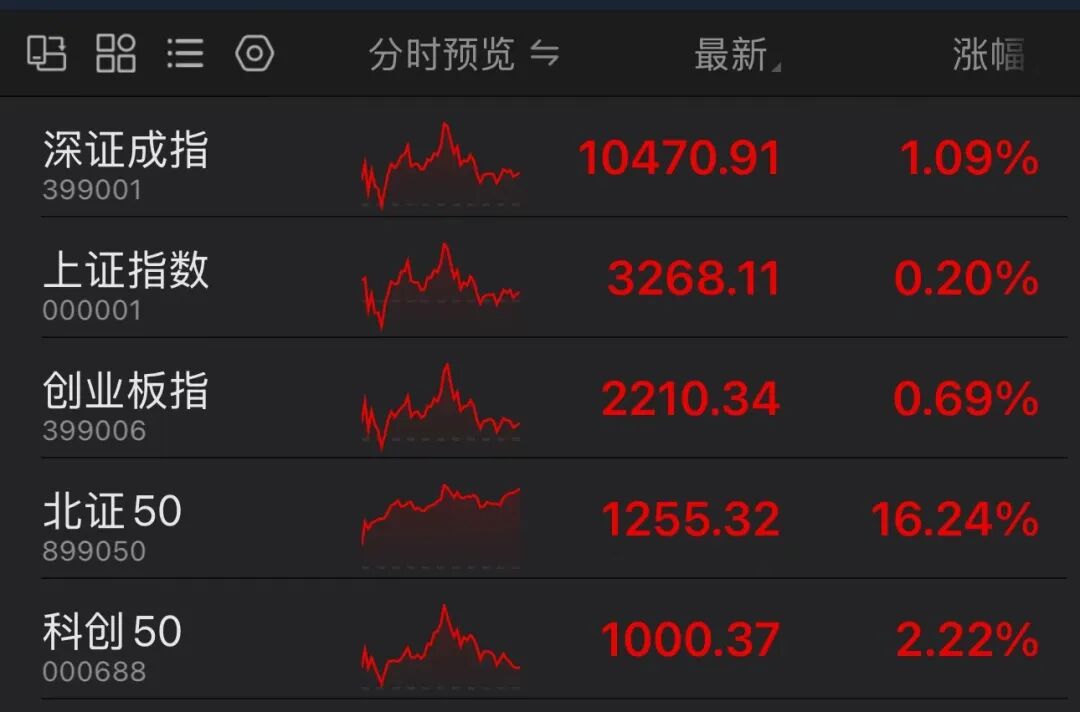 今日,A股整体小幅走高,成交略微放大至2.23万亿元。北证50表现最佳,放量大涨16.24%,创历史新高,成交454亿元,也刷新历史纪录;科创50指数冲高回落,盘中最高一度涨近9%,收盘回撤至涨2.22%,刚好收于1000点。