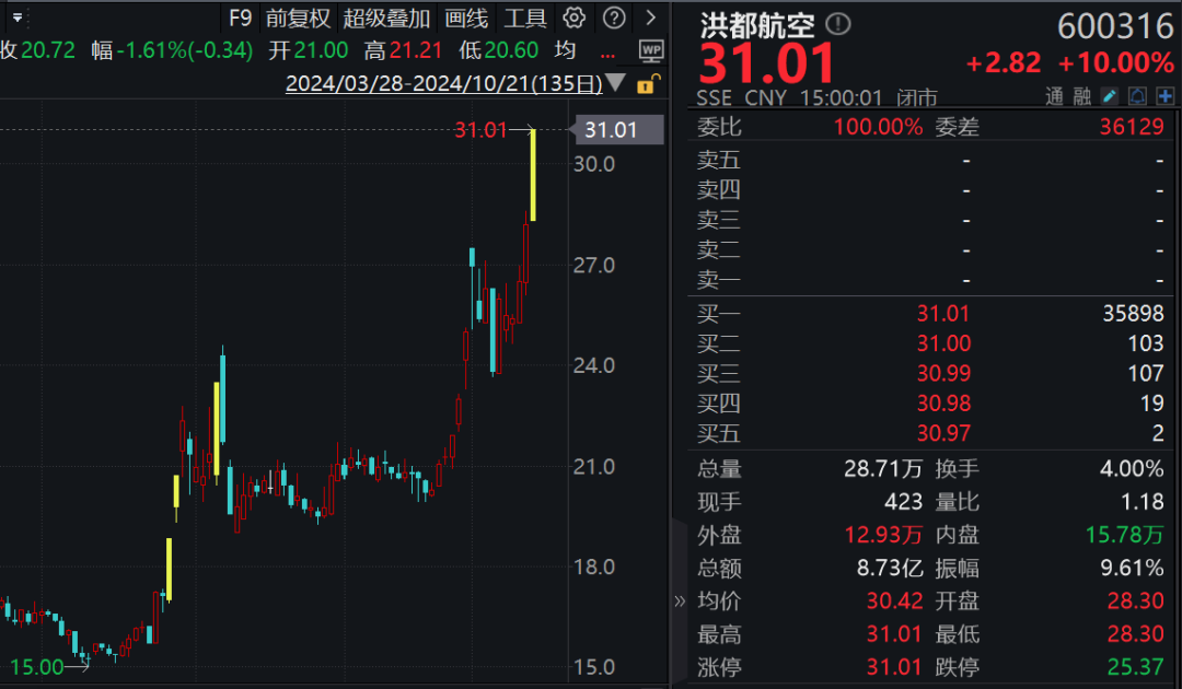 低空经济、商业航空、卫星导航等板块均大涨超5%,洪都航空、中国卫星、中信海直、天和防务等批量涨停。