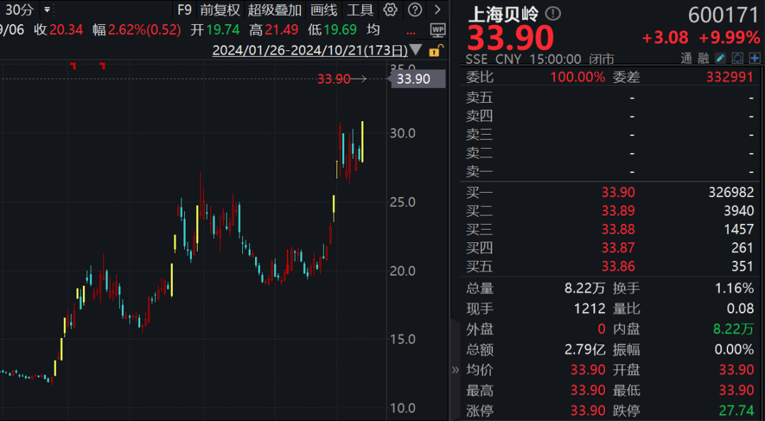 半导体板块也全线走强,芯片概念领涨,板块指数盘中最高涨逾7%,突破10月8日高点,创1年半来新高。华岭股份30%涨停,仅20%涨停的个股就多达15只,涨停或涨超10%的个股更是高达近40只。