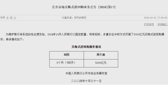 10月31日,中国人民银行官网“公开市场业务”栏目发布首个公开市场买断式逆回购业务公告(下称“公告”)称,为维护银行体系流动性合理充裕,2024年10月人民银行(下称“央行”)以固定数量、利率招标、多重价位中标方式开展了6个月期买断式逆回购操作5000亿元,实现了工具创设后的高效落地。